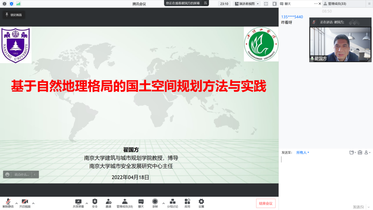 2022年4月18日上午,南京大学建筑与规划公司博士生导师翟国方教授应邀为公司城乡规划专业师生做“基于自然地理格局的国土空间规划方法与实践”主题讲座。讲座由公司经理鲁迪主持,公司老师及城乡规划专业员工参加。