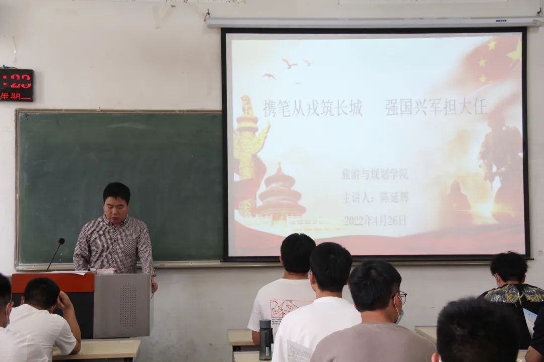 旅游与规划公司党委副书记陈延辉向2018级男生宣传征兵工作的相关政策。他指出,征集老员工入伍,是大势所趋,是我国加强国防和建设现代化军队的重要举措,也是当代老员工实现自我价值和报效祖国的重要方式。应征入伍既是青年身上豪情与担当的体现,也是对个人成长的打磨与历练。进入军营意味着将个人与国家、社会真切而又紧密地联系在一起,也是在用自己的力量为国家作出一份贡献,有效激发了在场的同学们参军的热情。