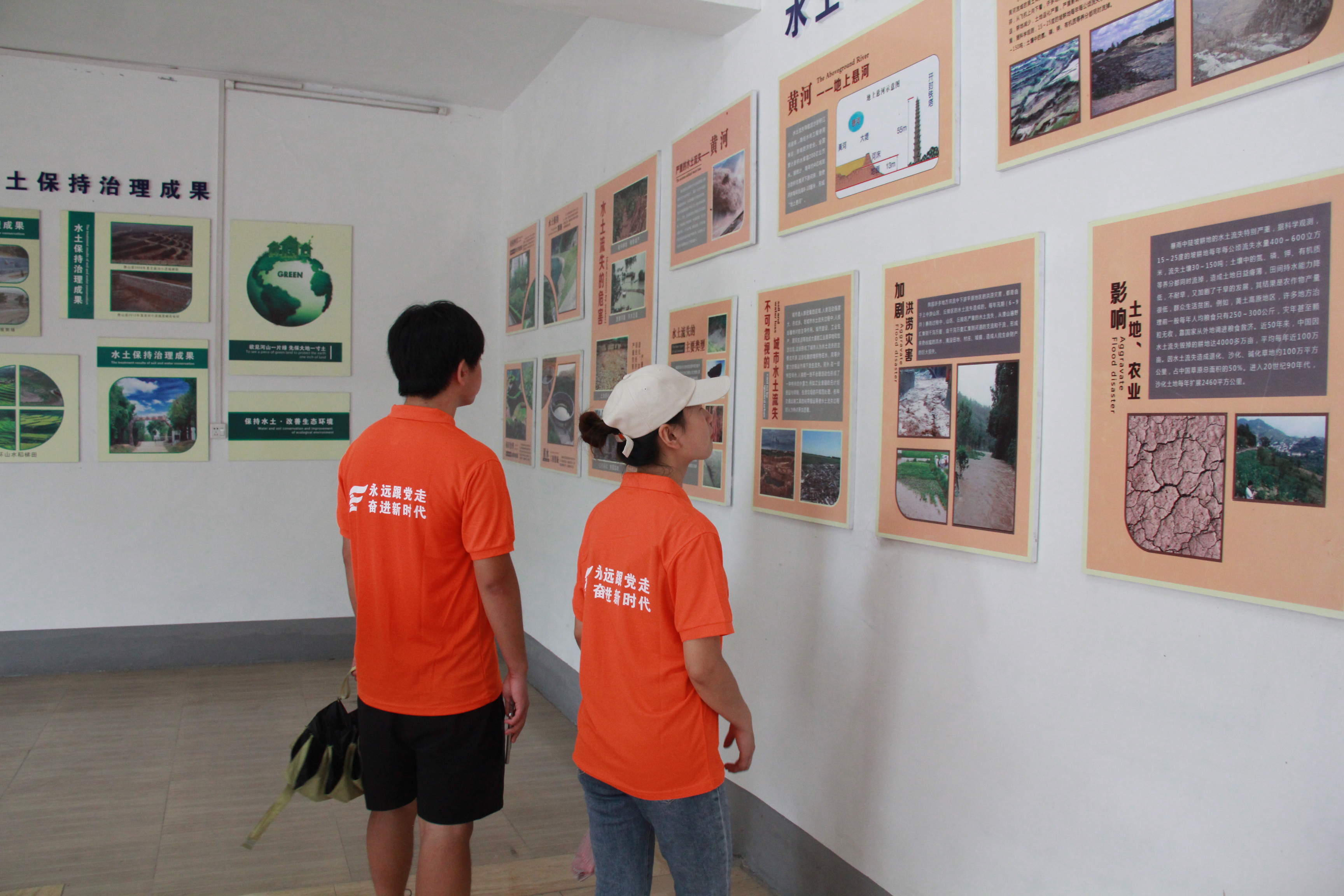 在参观了国防教育基地后,大家又来到了科普展厅。在展厅中,负责人王玉萍为我们讲解了林丰庄园区域的分布情况,以及近些年林丰庄园对水土保持与水土流失方面的治理情况。通过负责人的讲解以及展厅中林丰庄园示范园平面图以及鸟瞰图,使得志愿者们对林丰庄园的区域分布有了更加深入的认识。在科普展厅中,还展示了许多水土保持与水土流失的相关知识以及治理成果。