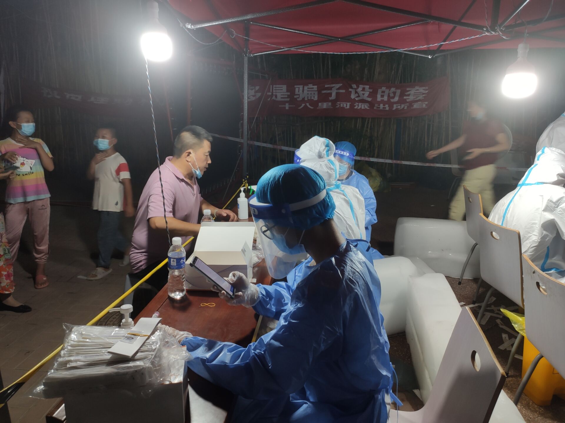 8月12日,新一轮的工作又开始了,我和我的同伴以及两名医护人员被上级领导安排到南小李庄村为隔离人员做双核酸检测。所谓隔离人员为去往过郑州六院的人员以及家属或密切接触者、中高风险地区回归人员,所谓双核酸检测,即咽拭子和鼻拭子两种都要做,每位隔离人员咽拭子和鼻拭子要分别做两遍,并分别用两种不同检测公司的试管存放。这样做只有一个目的——提高检测的正确率。我们这次的任务只有十一个人,可是这十一个隔离人员均为外来务工人员,被隔离的地方大部分为建筑工地。就这样,我们在该村村干部的领导下,穿上厚重的防护服,乘坐一辆敞篷三轮车就出发啦。一共十一位隔离人员,却分布在十个不同的建筑工地,在此途中,遇到的有隔离人员没有身份证、没有核酸检测登记码、找不到被隔离人员具体居住地址等一系列的特殊情况。