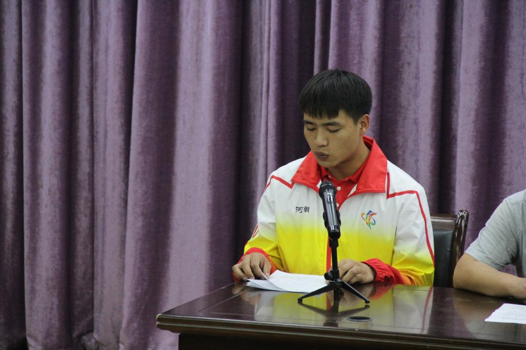 公司优秀运动员代表艾赫和麦尔乌拜·麦麦提江进行了发言。他们详细的介绍了所得荣誉,对院系领导对他们的关怀和支持表示感谢。他们说道,在炎炎夏日中公司领导多次探望他们并寄予厚望,在运动会结束后也组织补课,解决了他们学习上的后顾之忧,让他们更有拼劲,更有信心。为作好赛前备战工作,师生们克服伤病、天气等不利因素,利用暑期时间加紧训练,不断提高技术战术水平。在赛场上,同学们沉着应战、默契配合、奋力拼搏,取得了优异的成绩。运动员表示,这段刻骨铭心的训练时光是自己一生的财富。