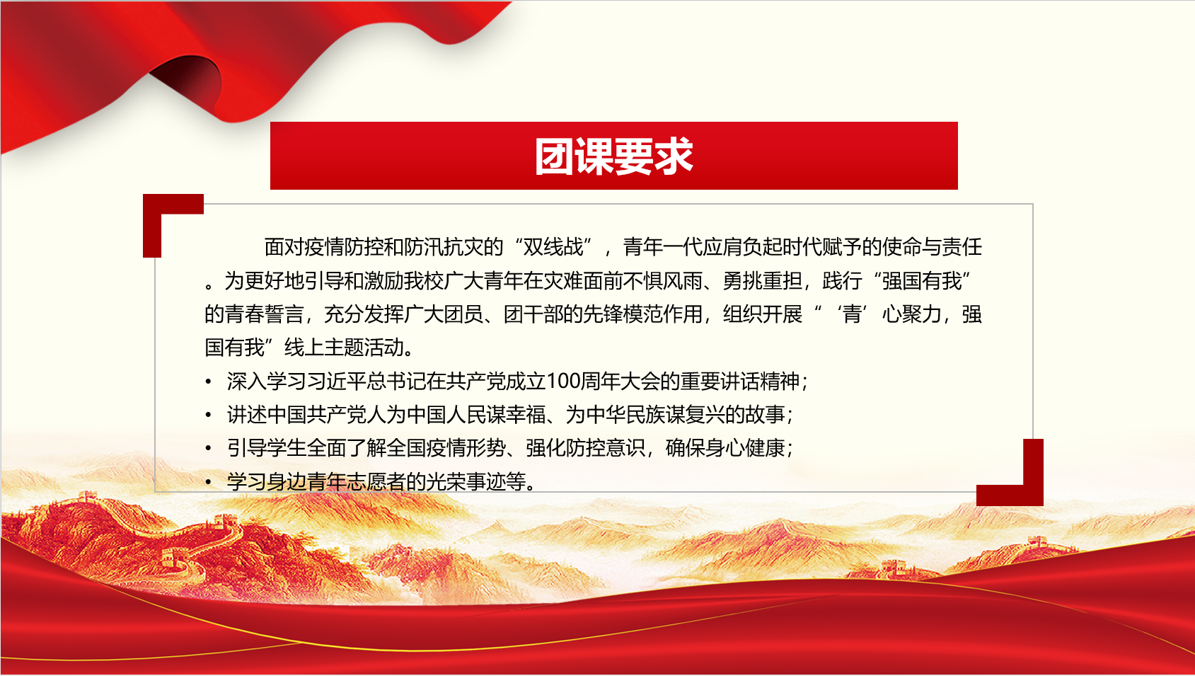 面对疫情防控和防汛抗灾的“双线战”,青年一代应肩负起时代赋予的使命与责任。为更好地引导和激励公司广大青年在灾难面前不惧风雨、勇挑重担,践行“强国有我”的青春誓言,充分发挥广大团员、团干部的先锋模范作用。9月2日下午,旅游与规划院开展“‘青’心聚力,强国有我!”线上主题团课。此次团课由公司团委书记张宁老师主持,公司200余名团员青年参与此次团课。