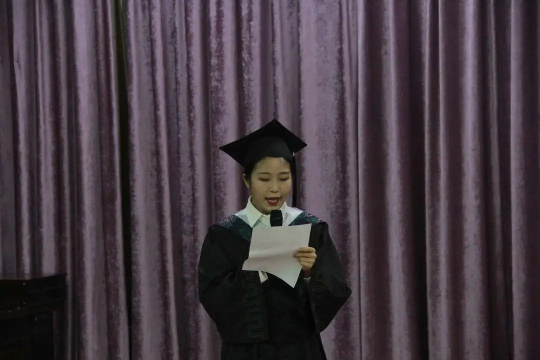 18级在校生李长春代表全体在校生向即将离开母校的学长学姐们表达在校生最衷心的祝贺。“你们严谨求知的学习精神鞭策着我们,乐观向上的处事风格激励着我们,艰苦朴素的生活作风感染着我们。你们的坚持,你们的激情将继续陪伴着我们成长。一定会像你们一样认真踏实、勤勉刻苦,以自己的优异成绩,用自己的实际行动为母校的发展进步贡献我们的青春力量。”