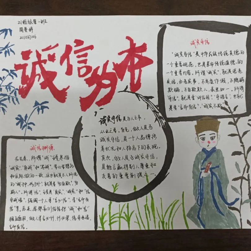 公司员工以“诚信伴我行”为主题进行书画作品创作,内容紧扣诚信主题,作品富有创造力、感召力。对于当代老员工而言,诚实守信不仅仅是应该遵守的道德,更是身为成年人应尽的职责,是做人之本、立世之本。