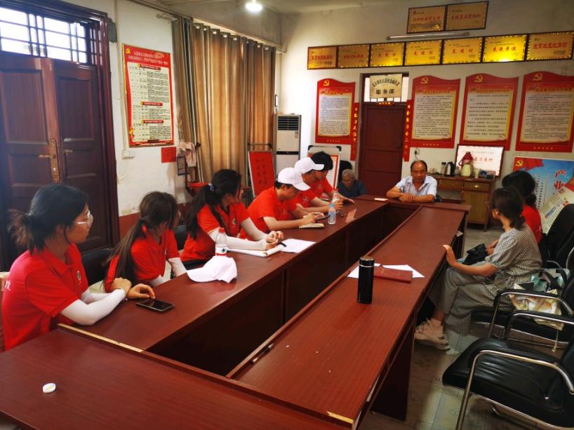 炎炎烈日中,团队在中午抵达了红石崖村的村委会办公室。红石崖村的党支部书记李建林对我们的到来表示热烈欢迎,这是一位质朴、热情的好书记。李书记为我们讲解了红石崖村的发展历史及现在的村庄规模、人口规模、特色产业等问题,对于同学们和带队老师的问题也都一一耐心解答。通过访谈,我们了解到,自从脱贫攻坚战打响以来,依靠党的扶贫政策,在各级党委、政府和市市场监督管理局驻村工作队的帮助支持下,红石崖村正在发生大变化。而且红石崖村在2019年6月被列入国家级传统村落,村里有多处百年以上的石头建筑,利用这一特色发展民宿产业,初步规划了10栋民居。
