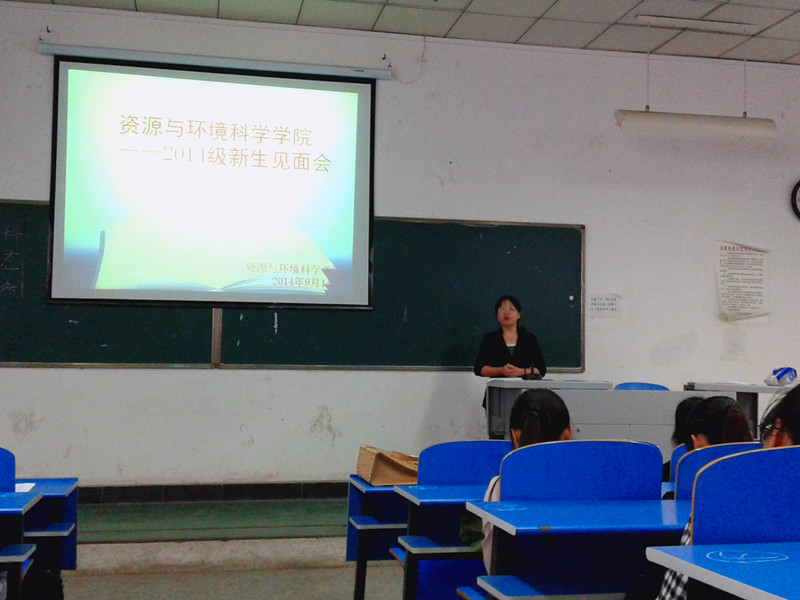 梁亚红经理首先对来自我国十个省份直辖市的275名新生们表示热烈欢迎,向同学们介绍了资环院的发展历程、现在的团队力量、学科专业建设、实验室建设以及公司师生在科学研究和服务社会方面所取得的优异成绩。特别以生态学徐雨和程立平两位博士分别获得2013年度、2014年度国家自然科学基金青年科学基金项目立项为例鼓励大家在今后的学习与生活中要注重实践和创新。梁经理还嘱托同学们要常有感恩之心、增强社会责任感,在资环院这个大家庭中勤奋学习,努力成为精专业,广学识,多能力的应用型人才。