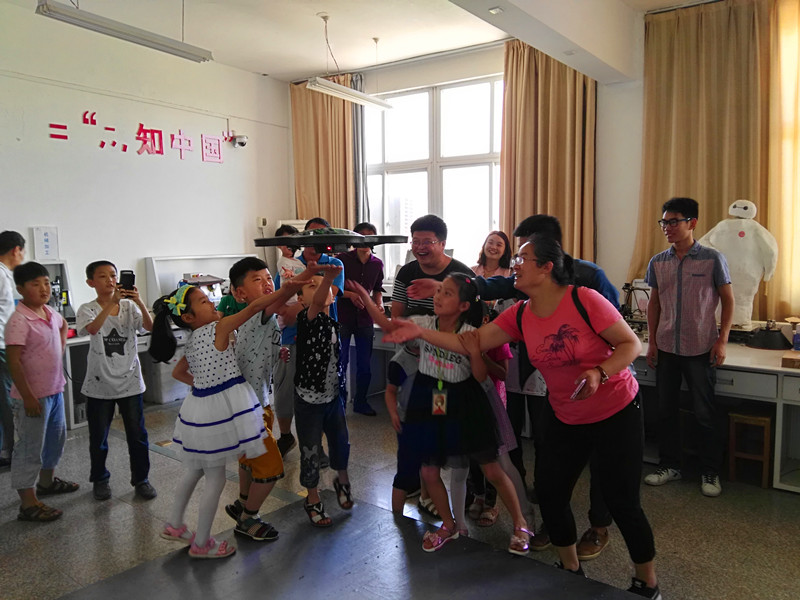 在实验室周志青老师的带领下,教职工和孩子们分成三组,分别参观美女机器人“小慧”,它有着乌黑亮丽的长发,齐刘海大眼睛,能够主动握手、对话、唱歌、跳舞等。同时大家还参观了物联网创新实验室的创新设计作品,有四轮驱动的武术擂台机器人、语音控制的智能小车、四轴旋翼飞行器、大白机器人等。工作人员还专门启动了智能交通平台,展现了未来版的智能交通系统,让到场的教职工和孩子们感受到高科技的成果,无比赞叹。活动结束后,分工会向每一位小朋友赠送学习用具和阅读图书等节日礼物。