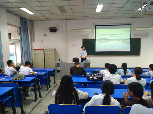首先以平顶山市某处湿地变化的图片引入本次讲座主题,产生了巨大震撼,吸引了同学们的学习兴趣。然后,以平顶山市为例,讲述了城市湿地的概念与功能、平顶山市城市湿地的分布与利用现状、城市化对城市湿地的影响和城市湿地的保护与利用对策四个方面的内容。王教授渊博的理论知识、丰富的真实资料,精彩的讲解赢得了同学们的阵阵掌声。