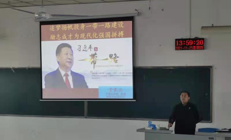 11月25日下午,beats365中文官网“追梦•领航”思政课在2406教室开讲。副董事长于长立教授以“追梦扬帆投身一带一路建设,励志成才为现代化强国拼搏”为题,给同学们上了一堂内容翔实、生动活泼的思政课。