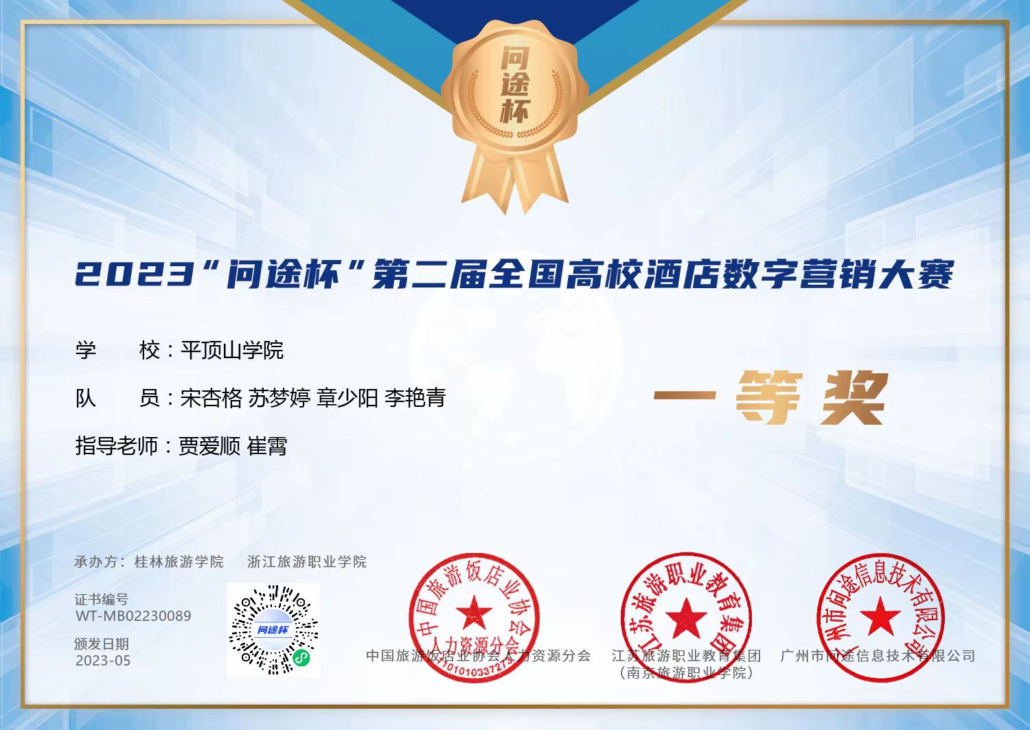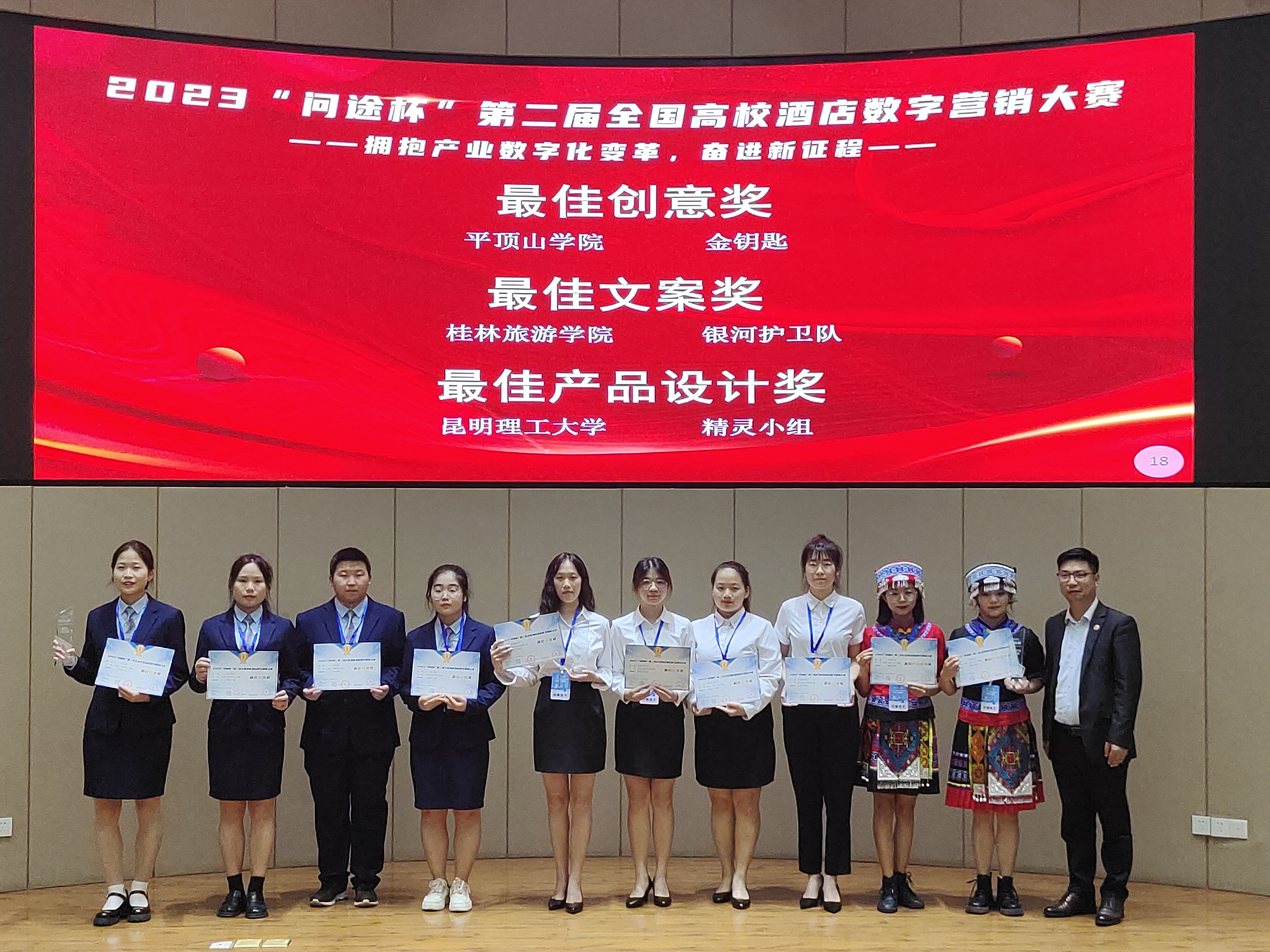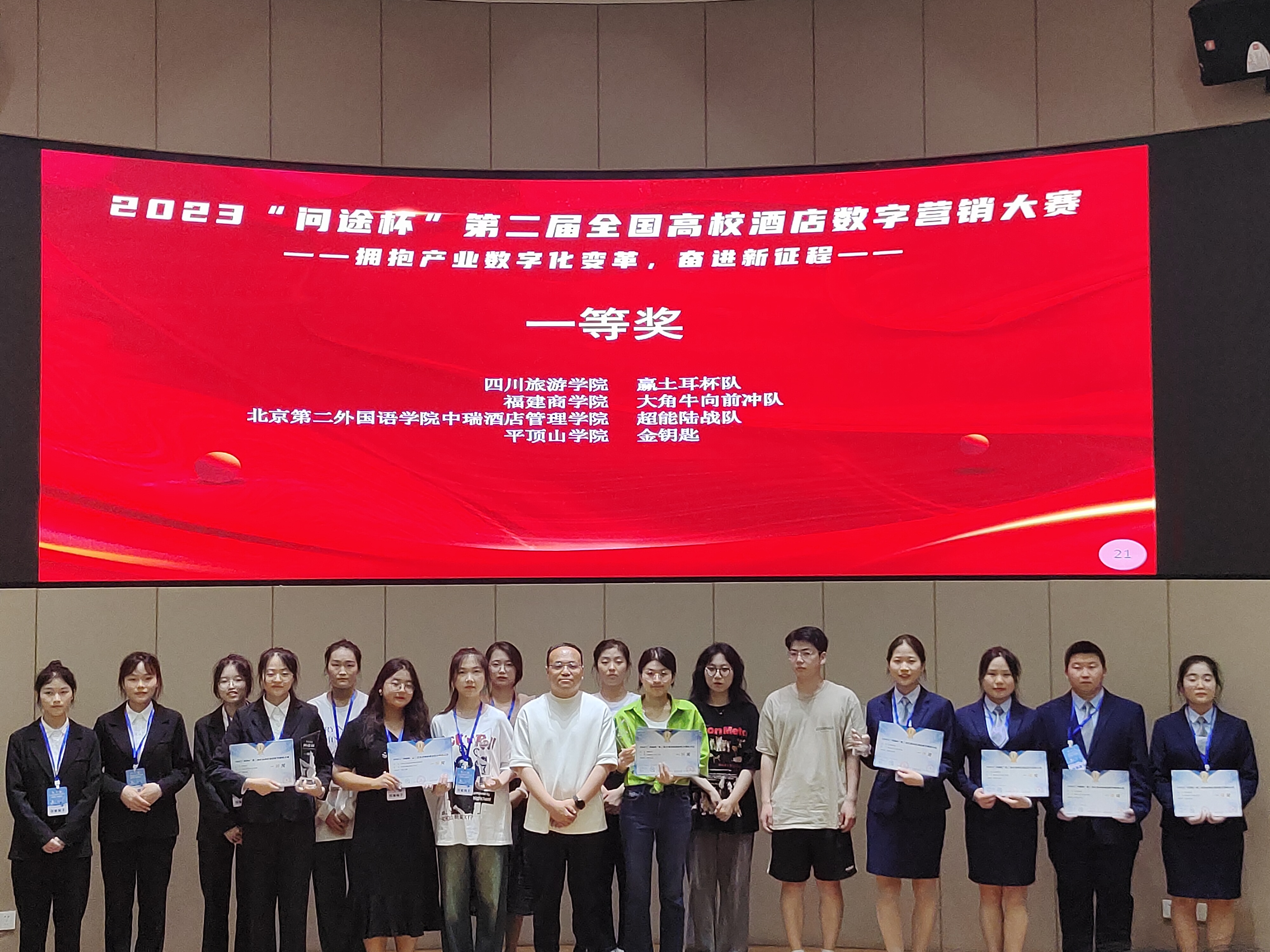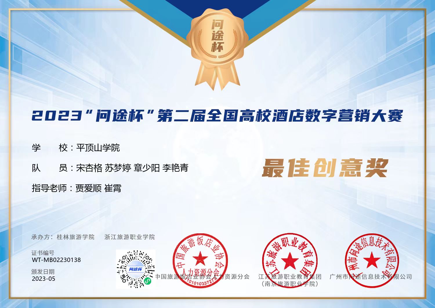 2023年5月27日,“问途杯”第二届全国高校酒店数字营销大赛(本科组)总决赛在桂林落下帷幕,由公司贾爱顺、崔霄老师指导的旅游管理专业宋杏格、苏梦婷、章少阳、李艳青4名同学,共同组成“金钥匙队”,喜获“一等奖”(全国排名第十)以及单项奖“最佳创意奖”;贾爱顺、崔霄老师荣获“优秀指导老师奖”。