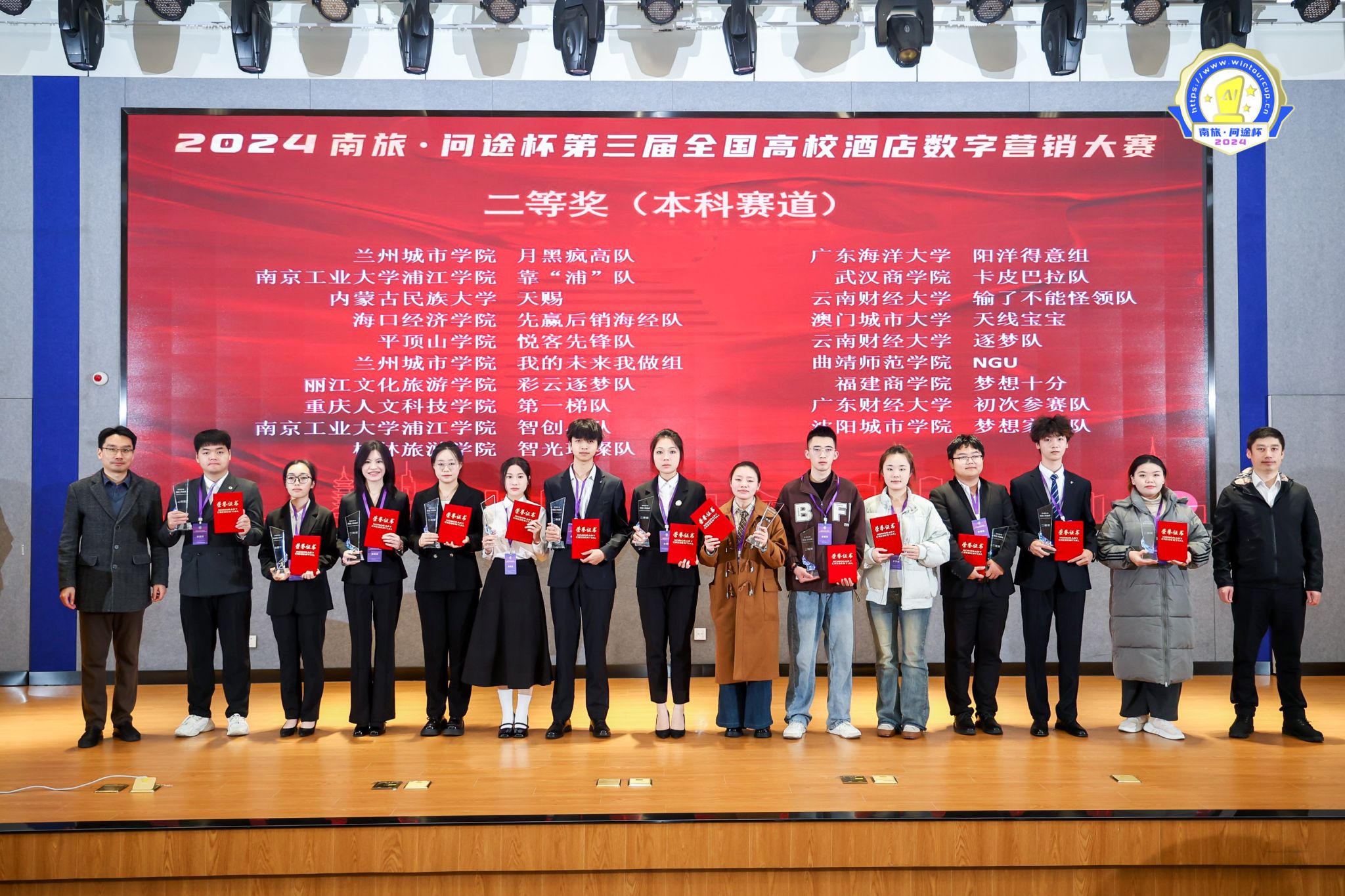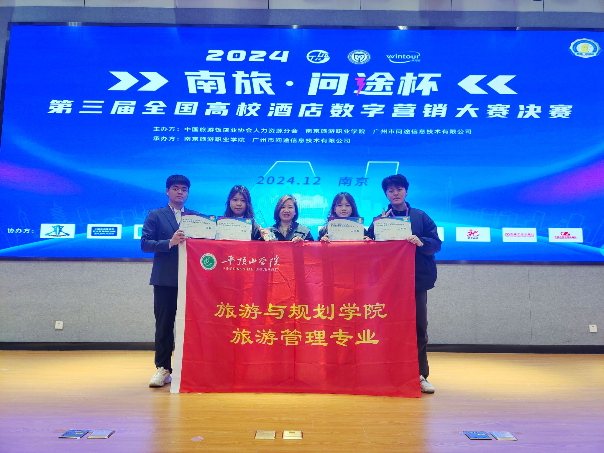12月7日,“南旅·问途杯”第三届全国高校酒店数字营销大赛决赛在南京落下帷幕,beats365中文官网贾爱顺老师指导的由旅游管理专业员工王帅波、郭薇、李扬帆、视觉传达专业员工王琦组成的“悦客先锋”队喜获二等奖;另外由旅游管理专业员工邱姝语、牛凤婵、尚琰芹、姚思懿组成的“似火如荼”队,廖紫嫣廖思雨、周子惠、高洁组成的“多余的解释”均获得三等奖。