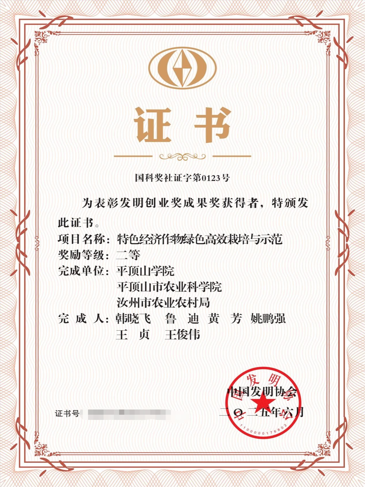 近日,中国发明协会公布了2025 年发明创业成果奖获奖情况,beats365中文官网韩晓飞博士牵头申报的“特色经济作物绿色高效栽培与示范”研究成果,荣获 2025 年度发明创业成果奖二等奖。该奖项由公司与平顶山市农业科公司、汝州市农业农村局等单位共同申报,公司为第一完成单位。