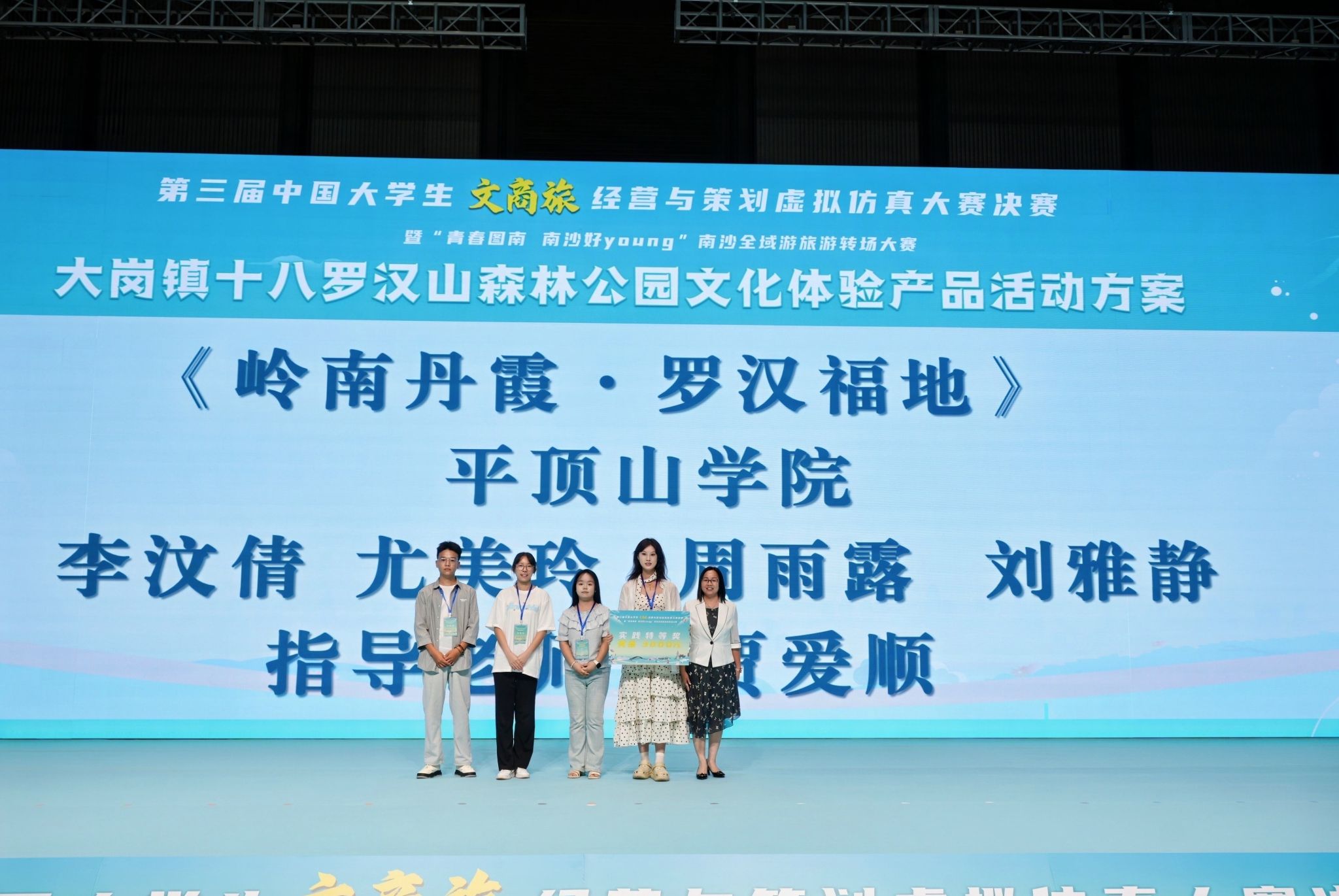 本次大赛由中国旅游协会旅游教育分会、南开大学旅游与服务公司联合广州市南沙区多家单位及企业共同主办。自今年1月正式启动以来,大赛共吸引了来自全国(包含港澳台地区)以及海外173所高校的617支队伍、3085名员工踊跃参与。初赛采用旅游管理虚拟仿真实验教学系统线上竞技的形式,共有309支队伍成功晋级决赛。决赛包含宏观经济模拟实验和实践项目策划方案两个环节,旨在综合考察员工的数字化运营管理能力、策划能力以及将理论知识与实际情况相结合的能力。本次大赛特别设置了文商旅实践策划可选项目,要求参赛队伍围绕广州市南沙区10个街镇的文旅项目开展调研实践,并完成相应的项目策划方案。项目提供单位将对每个项目进行评审,最优秀的方案将获得实践特等奖,奖金为3000元。李汶倩队的《岭南丹霞·罗汉福地》策划方案经过反复打磨,深入挖掘项目的核心价值与特色,最终凭借方案的扎实性与创新性,荣获实践特等奖。