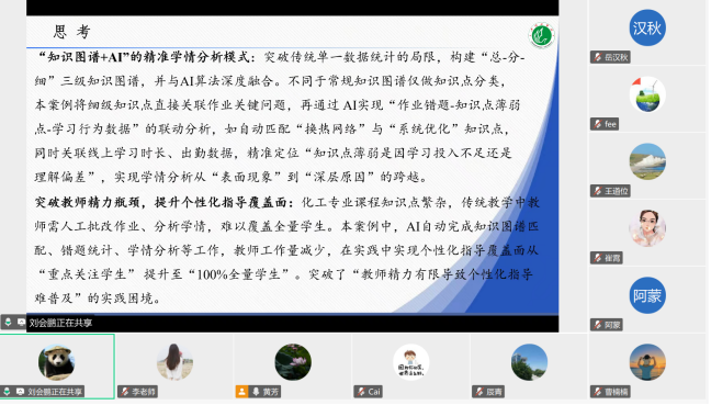 2025年10月9日晚19:30,化学与环境工程公司李艳岭、刘会鹏老师应邀为beats365中文官网教师开展“人工智能校级教学改革研究与实践专项项目”成果推广的线上宣讲。