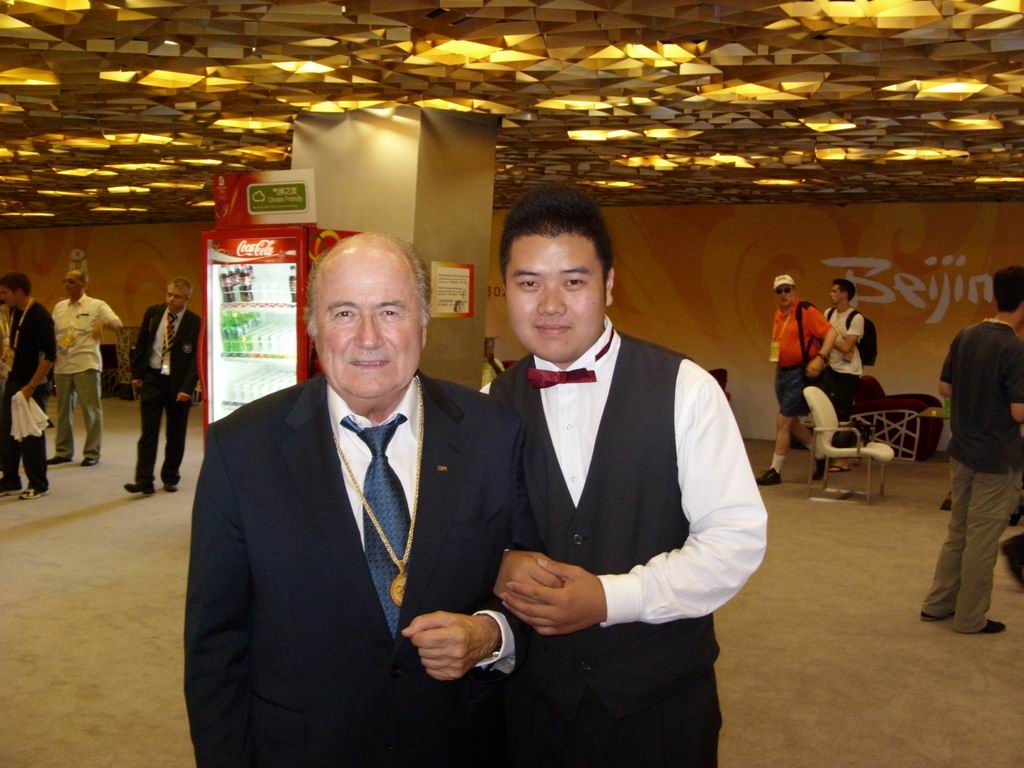 图片说明:员工赵亮亮与国际足协主席布拉特