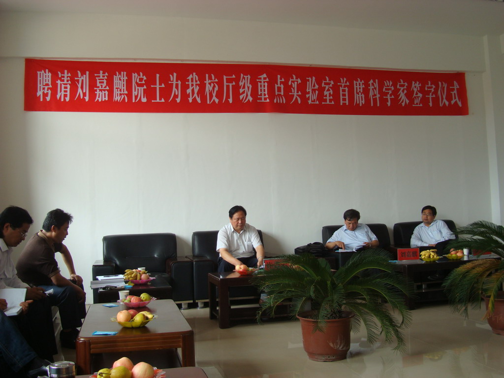 图片说明:聘请刘嘉麒院士为公司厅级重点实验室首席科学家签字仪式在办公楼三楼会议室举行。仪式由副经理罗士喜教授主持,公司党委书记许青云为刘院士颁发了聘书。