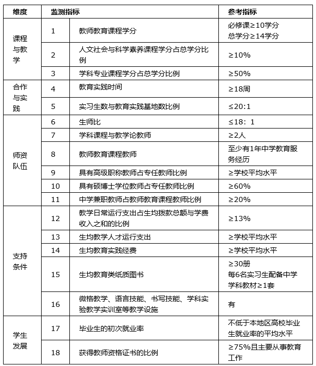 中学教育专业认证标准(第二级)监测指标