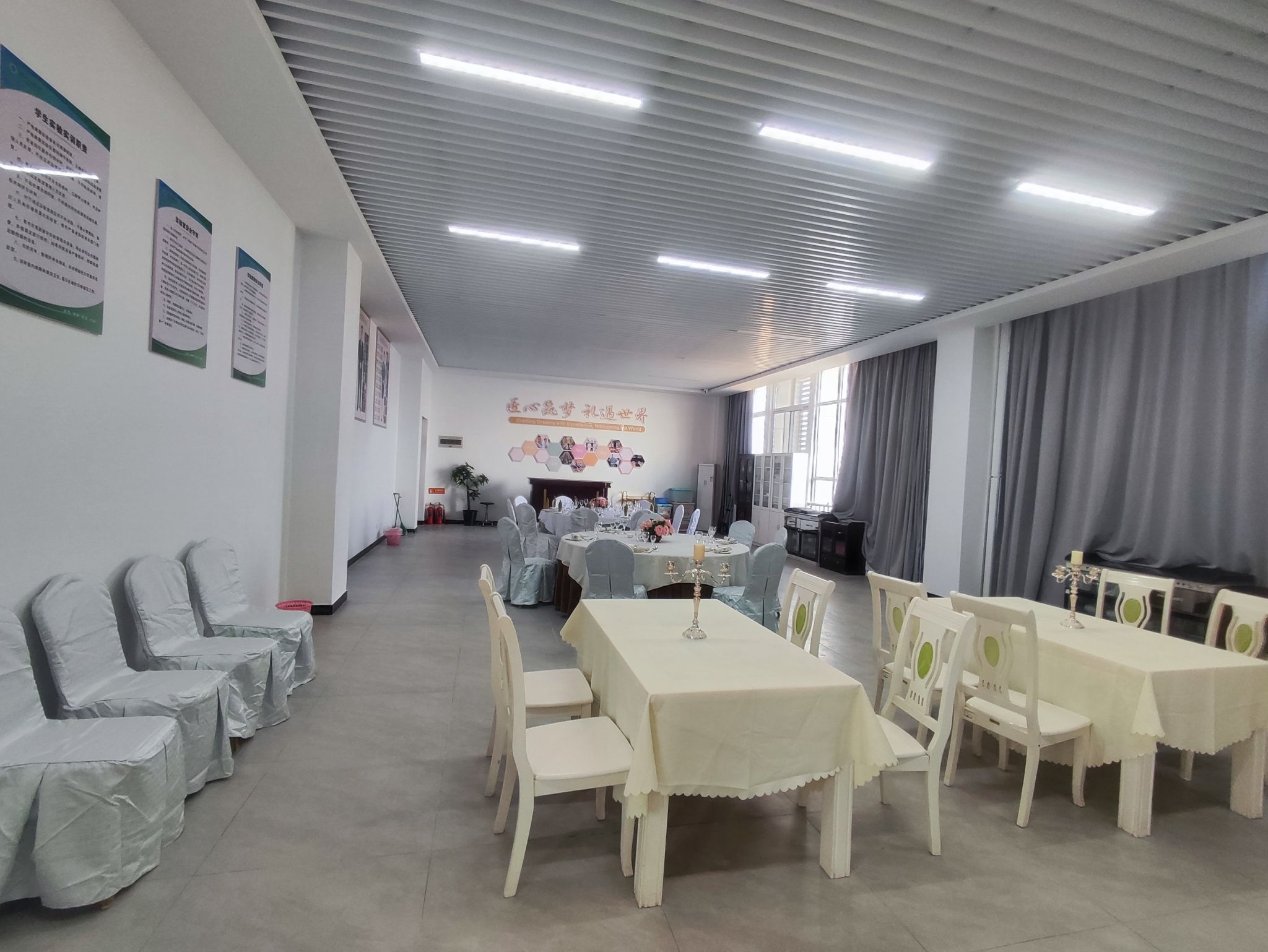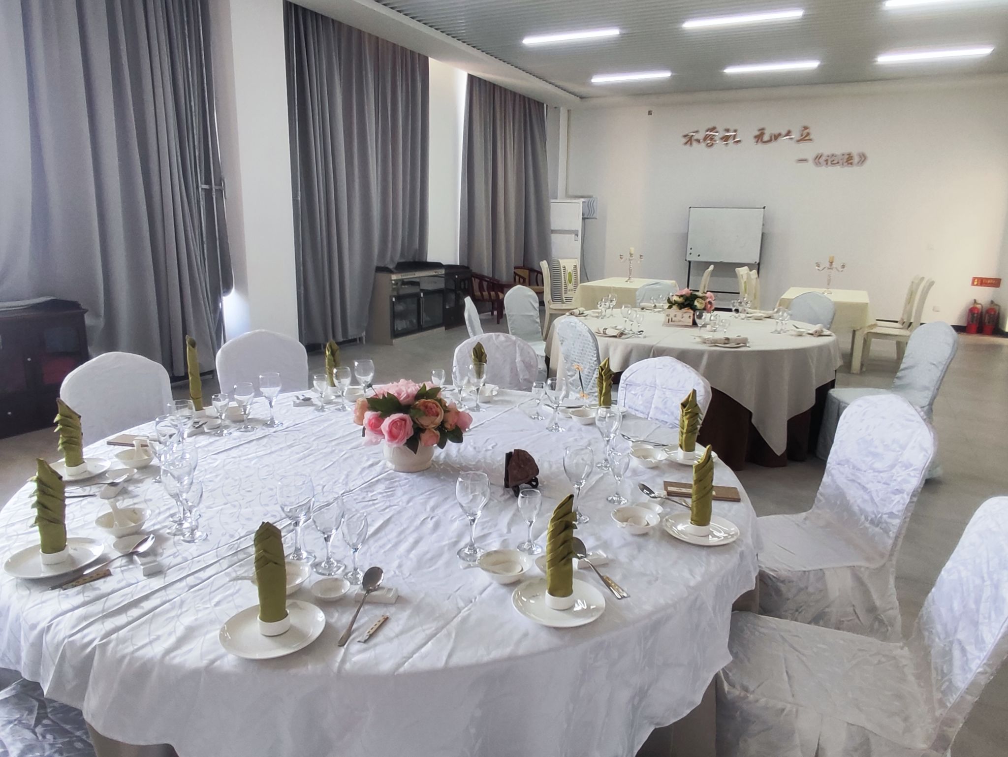 旅游服务与商务礼仪实训室(行知楼RC401),面积119.35㎡,目前开设有托盘服务技能训练、餐巾折花技能训练、斟酒服务技能训练、中餐宴会摆台、中餐零点摆台、中餐宴会服务流程、西餐摆台和茶席设计、个人形象礼仪、日常交往礼仪、旅游商务宴请礼仪、旅游接待服务礼仪等实验项目。