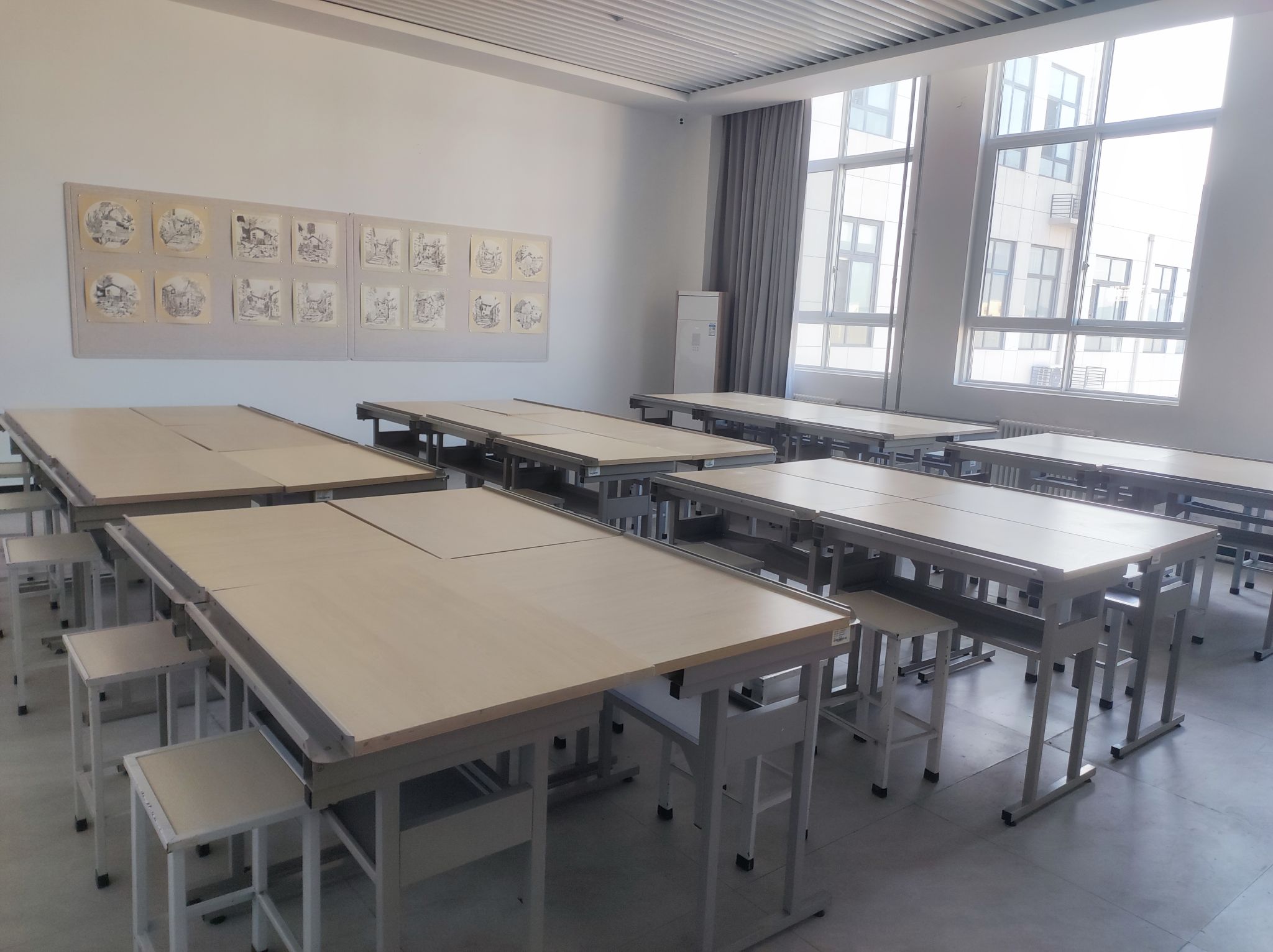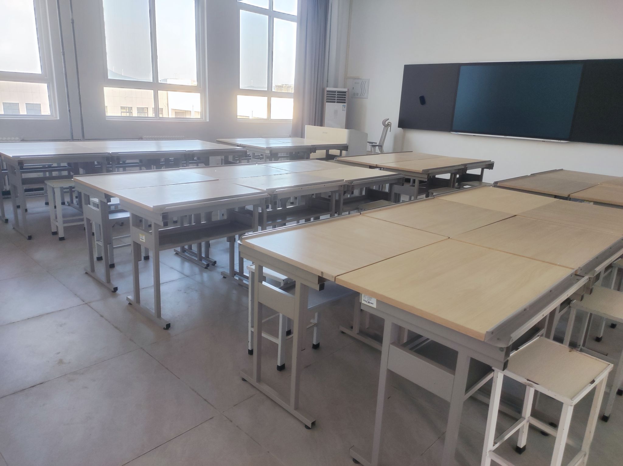 手工设计实验室02(行知楼RC411)面积62.91 m²,主要设备有:智慧黑板、绘图桌椅、毛毡展示墙等。