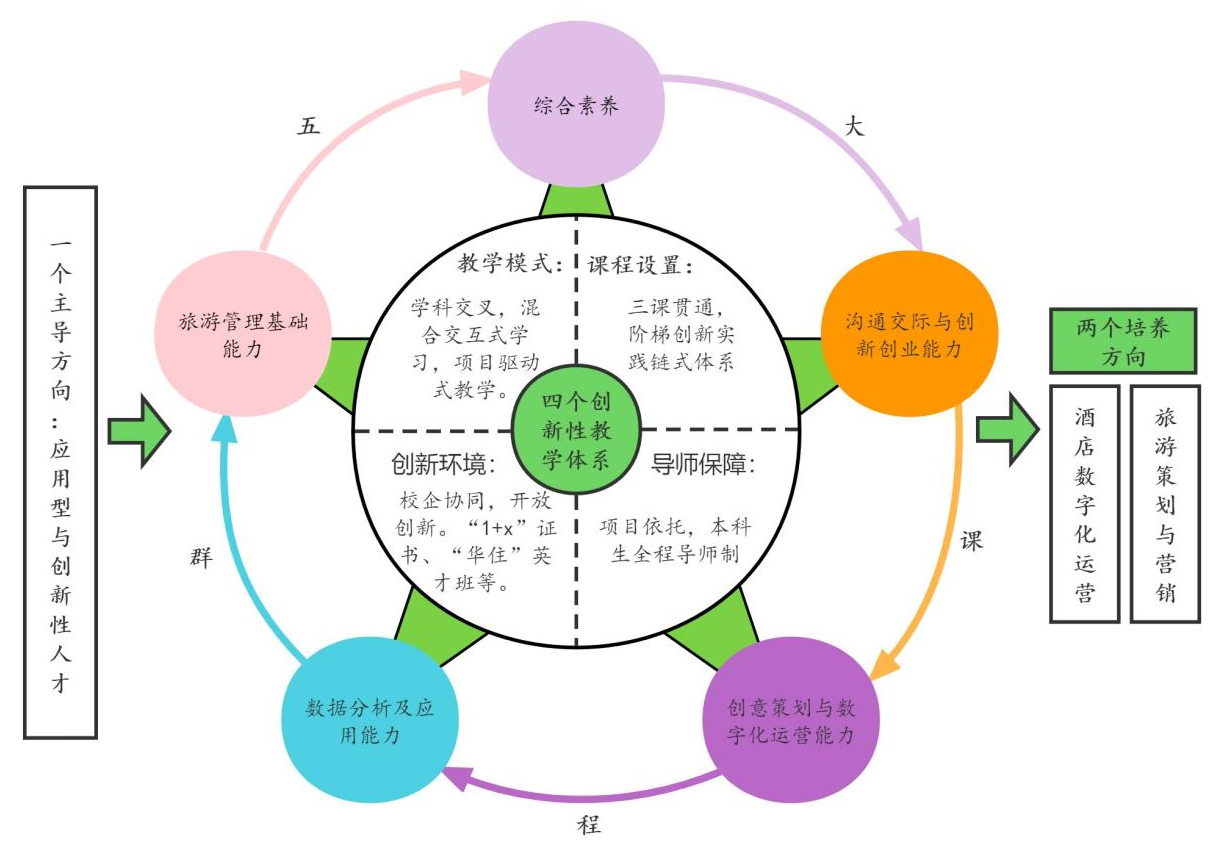 培养目标:本专业以“实践引领、平台支撑、校企融合、服务地方”为宗旨,以智慧旅游与数字化运营为特色,培养掌握旅游及酒店业的基本理论与专业技能,熟悉行业发展前景、趋势以及先进的管理理念与服务标准,具有商业战略思维和深厚的行业底蕴,具备接待与服务能力、运营与管理能力、公关与智慧营销能力、活动统筹与策划能力的高素质应用型人才。