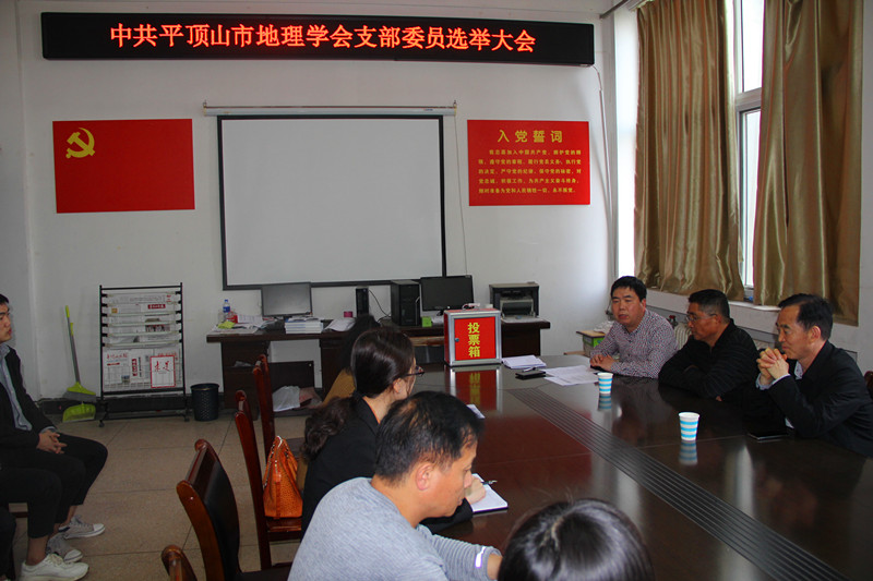 2019年4月23日下午,平顶山市地理学会召开党员代表大会。18名正式党员代表参加了此次会议。地理学会党支部按照《中国共产党基层组织选举工作条例》和有关规定,经与会党员充分酝酿讨论,根据多数党员的意见确定候选人之后,采用无记名投票差额选举的办法,选举产生了中共平顶山市地理学会党支部委员会。4月24日上午,中共平顶山市地理学会党支部委员会召开了第一次全体会议,选举产生了中共平顶山市地理学会党支部委员会书记。具体如下: